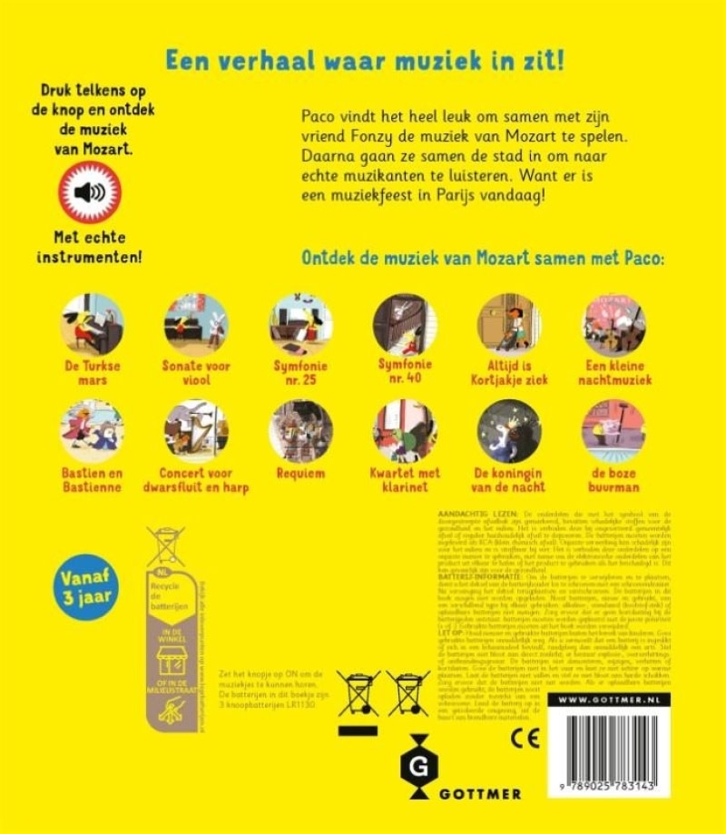 Paco en zijn vriend Fonzy vinden het superleuk om samen de muziek van Mozart te spelen. Maar nog leuker is het om in de stad naar de echte muzikanten te gaan luisteren. Want vandaag is er een muziekfeest in Parijs. Een verhaal waar muziek in zit geschikt voor kinderen vanaf 3 jaar.